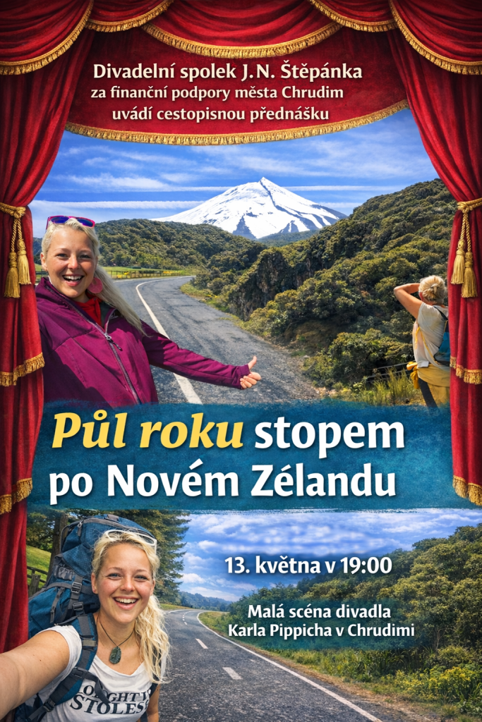Půl roku stopem po Novém Zélandu s batohem na zádech. Velmi osobní a autentická přednáška o tom, jak se Aneta Vavřínková, herečka, loutkoherečka, muzikantka, zpěvačka, hudebnice, členka Divadelního spolku J.N.Štěpánka ve 25 letech rozhodla, bez předchozích cestovatelských zkušeností, peněz, pracovního víza a alespoň základního orientačního smyslu, vydat sama na druhou stranu světa, aby tam zažila ten nejintenzivnější a nejsvobodnější půlrok svého života.